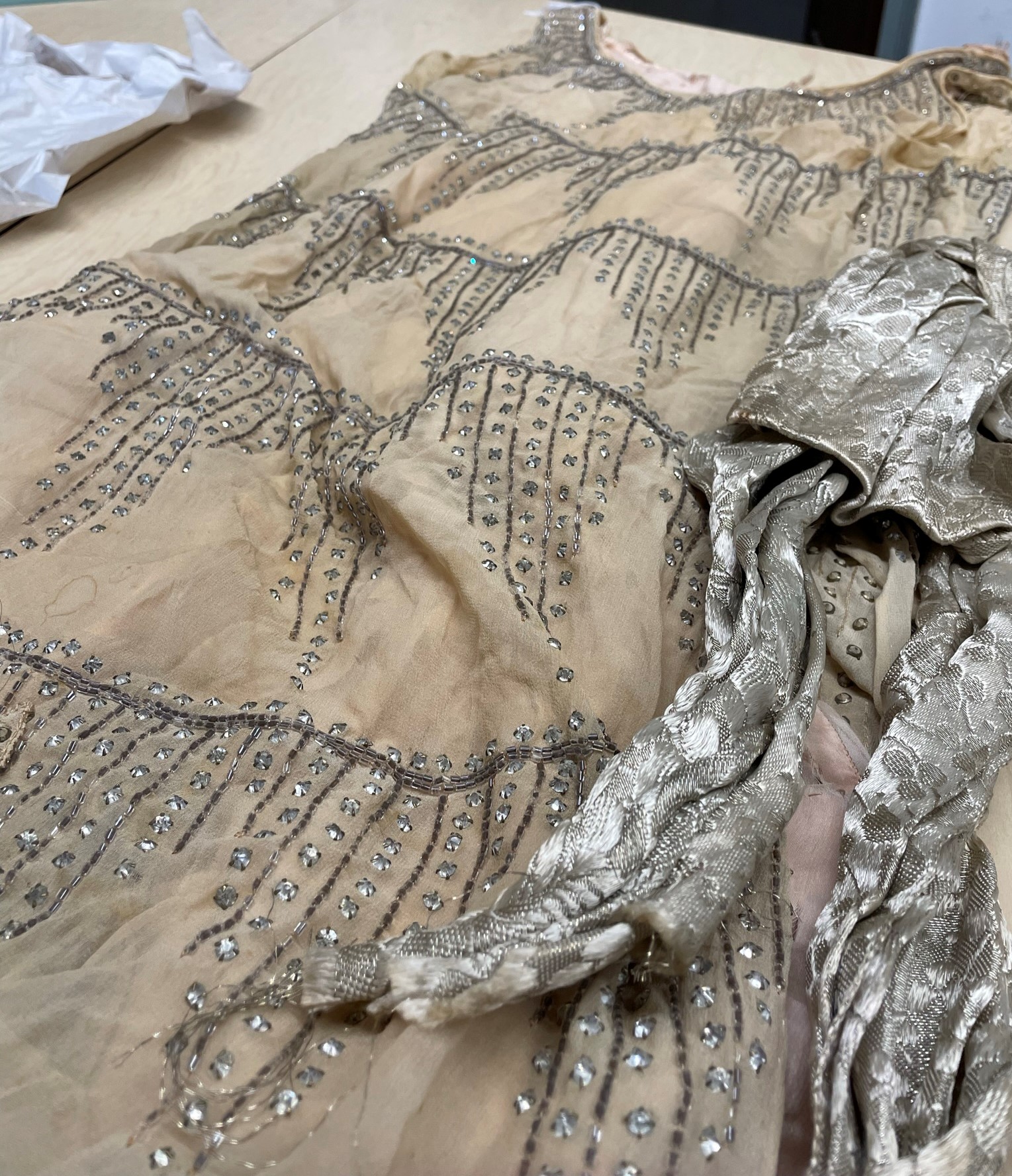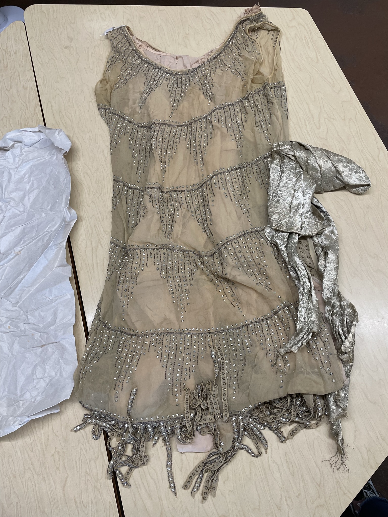 I met with Dr. Welters, Director of the Graduate Program and the Historic Textile and Costume Collection, and Susan Jerome, Collections Manager. The three garments I shared were a taffeta gown, a wool baseball uniform, and a silk flapper dress. Each piece was unique and beautiful in their own right, but required some attention in terms of conservation. Each garment was evaluated for age and condition, along with preliminary recommendations for care.