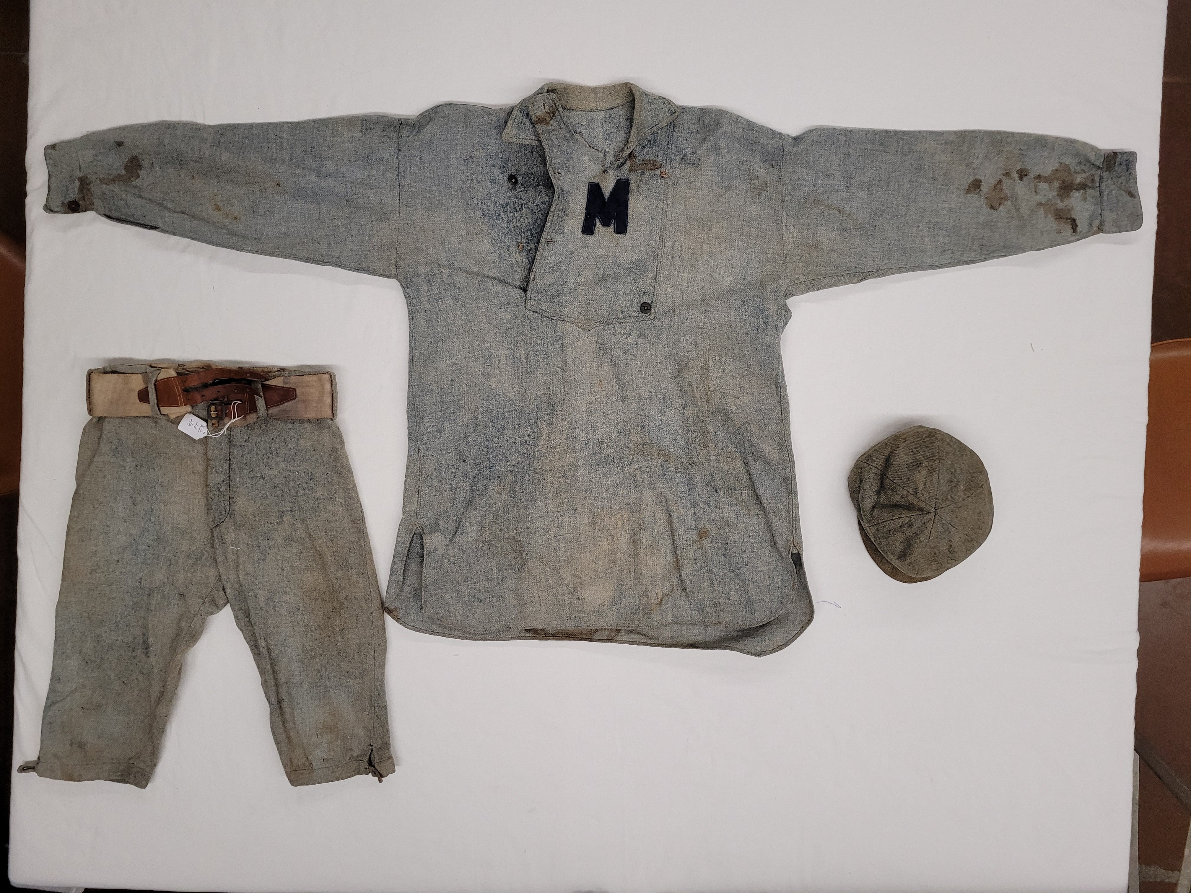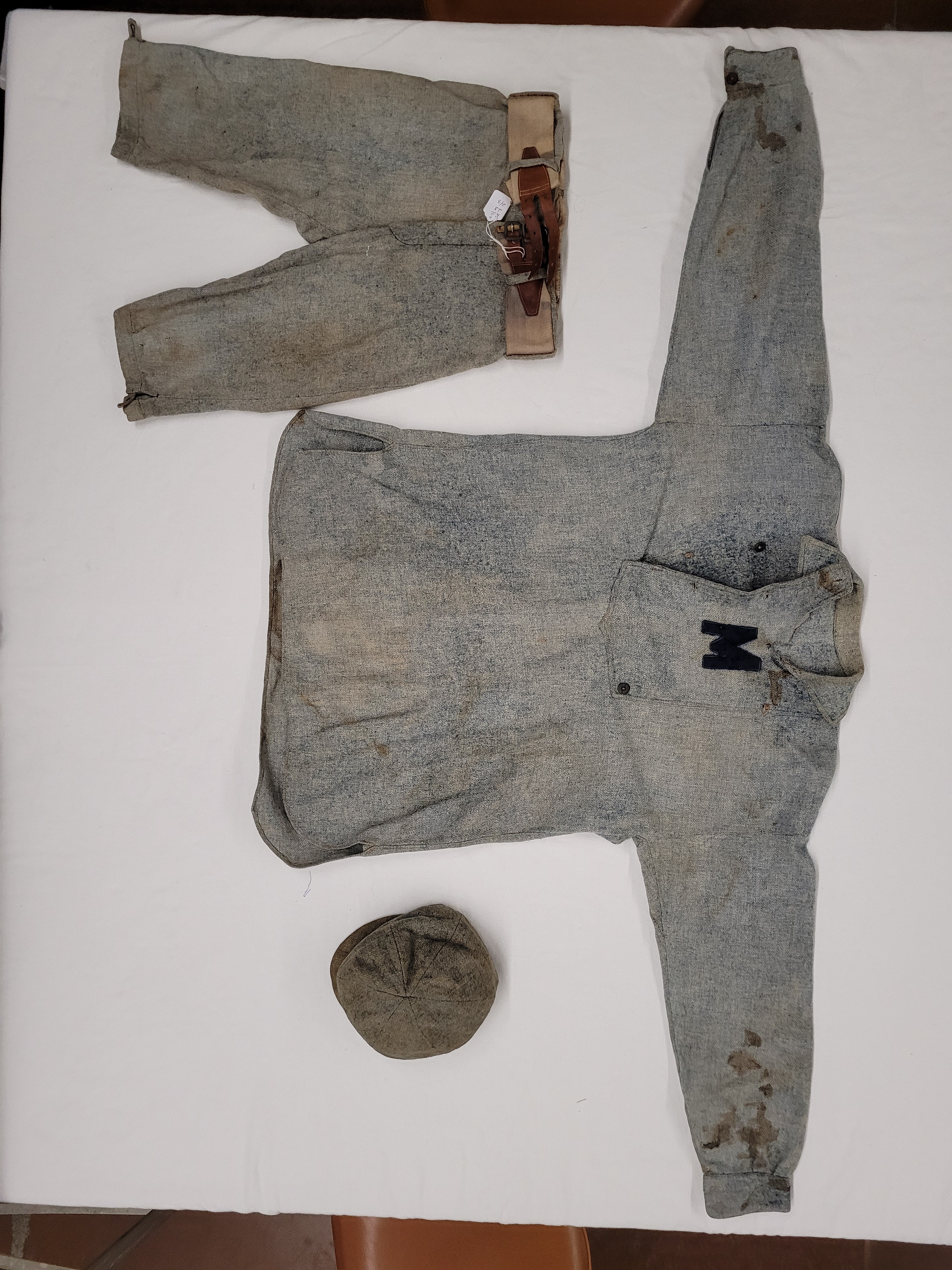 Arriving at the University of Rhode Island’s Textile Conservation Lab in overall good condition for its age and usage. Although our modern sensibilities are drawn towards clean and new clothing, the sweat-stained cap and dirt within the seams of the pants provide evidence that the uniform was used in game play. It is easy to imagine a player standing in the outfield under the hot sun or sliding to reach the base after a fly ball. Keeping evidence of use is important to telling the story of early baseball.